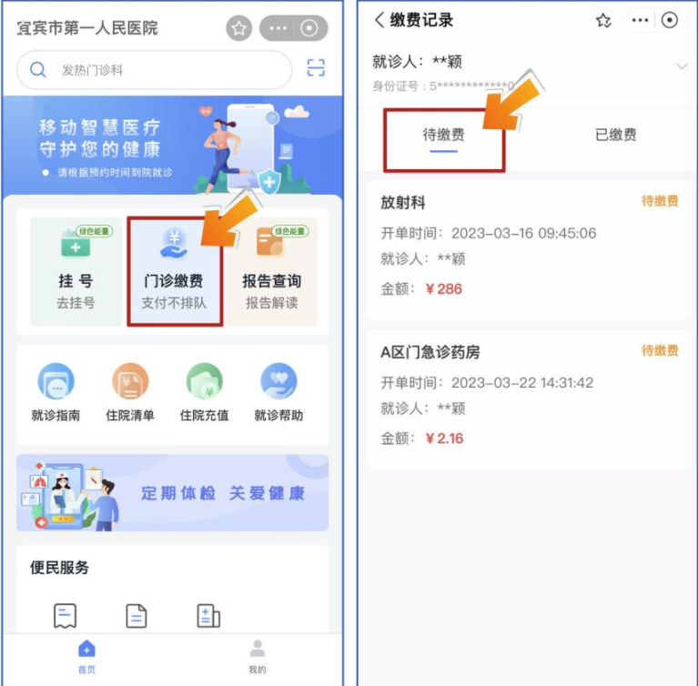 1.点击“门诊缴费”,选择“待缴费”项目。