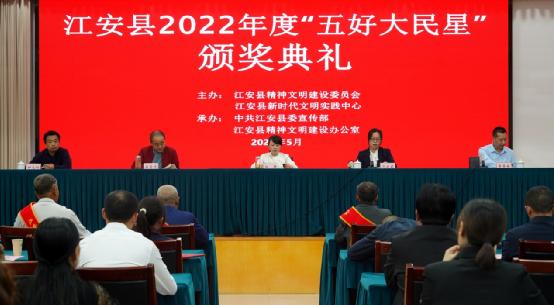 四川新闻网消息 5月8日,由江安县精神文明建设委员会、江安县新时代文明实践中心主办,中共江安县委宣传部、江安县精神文明建设办公室承办的2022年度“五好大民星”颁奖典礼举行,10位(个)“五好大民星”个人和家庭受表彰。江安县委常委、宣传部部长白静,县人大常委会副主任易奇志,副县长范晓莉,县政协副主席钟元刚出席活动。