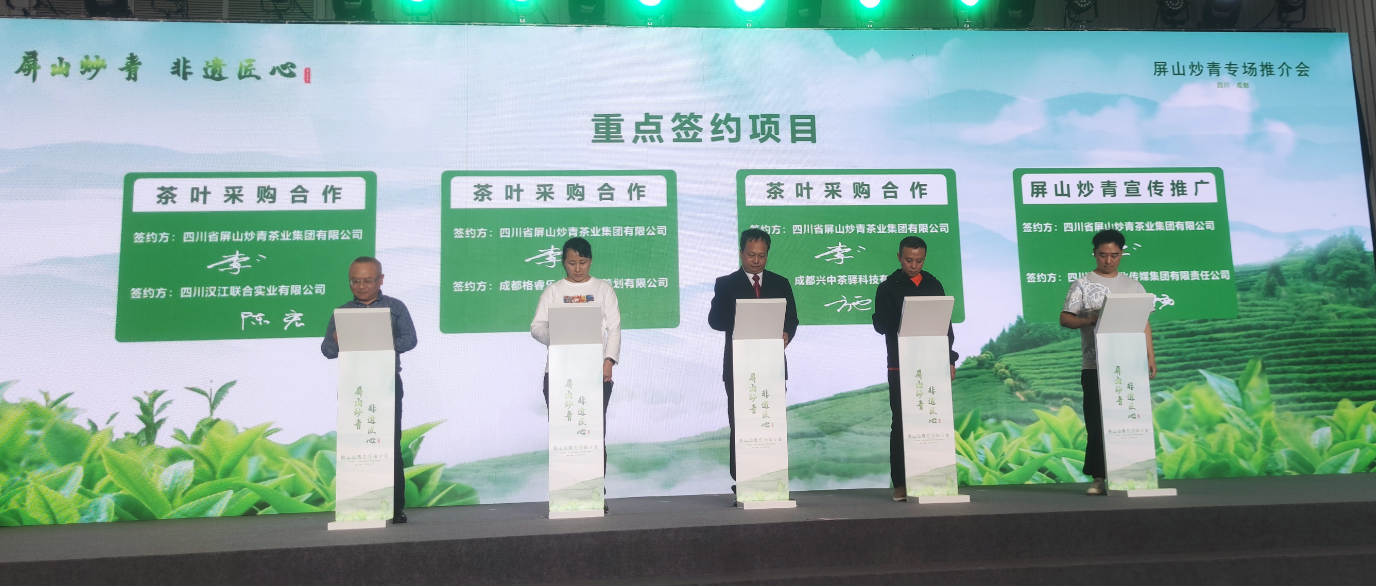 在推介会上,分别对屏山茶产业、屏山炒青系列产品进行推介,为屏山炒青非遗传承人刘兆伦授牌,现场抽奖互动,为8位获得屏山县首届“炒青大师”称号的获奖者颁奖,屏山茶产业发展合作、重点项目签约仪式,屏山炒青歌舞表演。