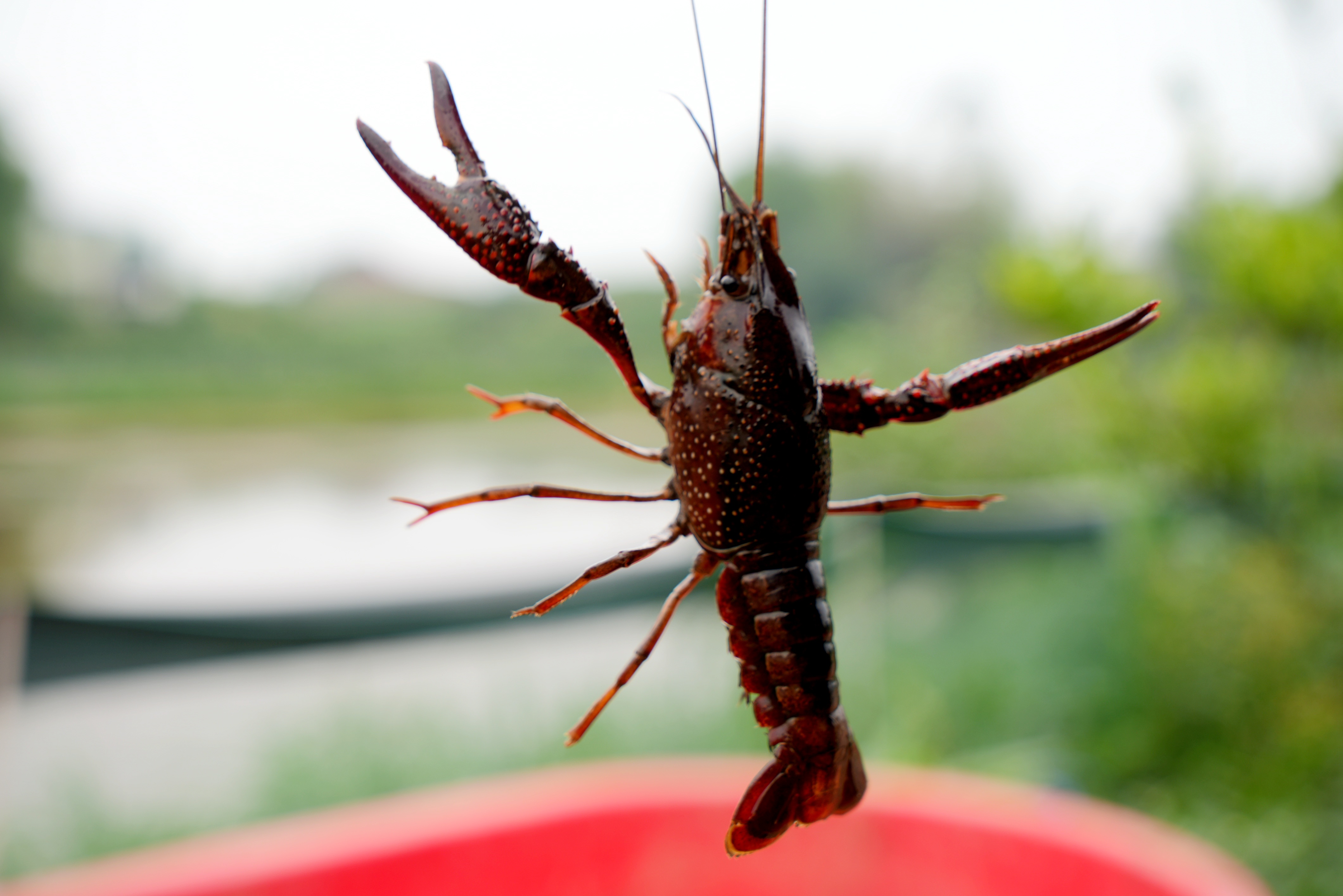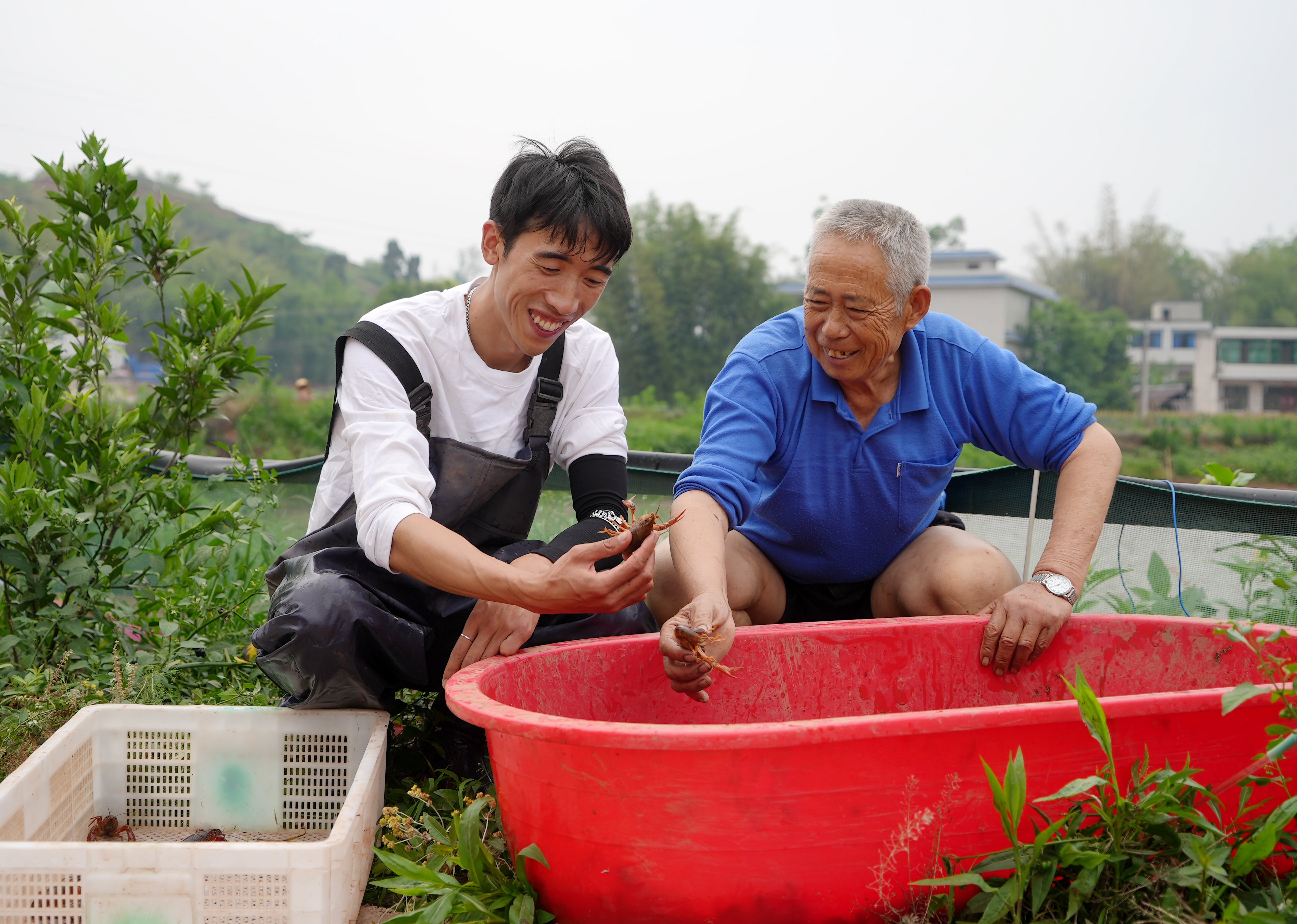 张骑熟练地将沉在水里的地笼一格格拉起,一只只色泽鲜亮、活蹦乱跳的小龙虾被倒入盆内。