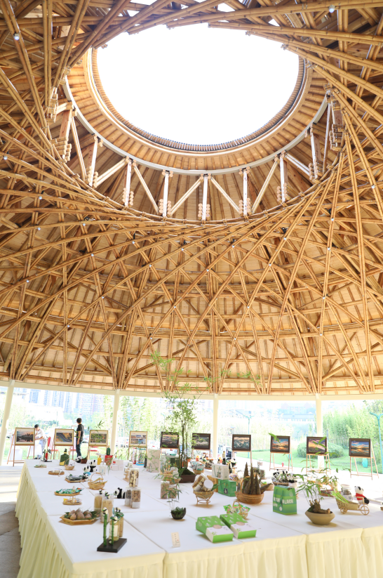 在公园一角的竹亭里,“竹”味十足的竹工艺展览精彩纷呈。技艺精湛的竹编画、栩栩如生的竹编竹荪竹笋、惟妙惟肖的竹雕大熊猫、琳琅满目的竹酒竹美食布满了整个竹亭。在展台一旁的创作区里,竹工艺大师们正聚精会神、精雕细琢,用刻刀与竹丝,一刀一丝打磨着手中的竹雕和竹编工艺品。