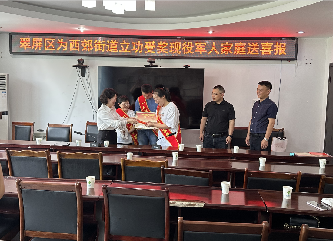 四川新闻网消息 近日,宜宾市翠屏区退役军人事务局局长聂家芮一行到西郊街道为立功受奖现役军人家庭开展送喜报集中颁发仪式。