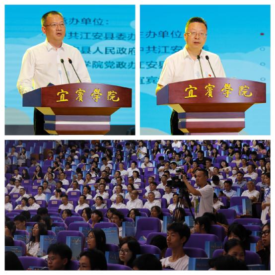 蔡乐才在致辞中推介,长期以来,宜宾学院自1978年开始举办高等教育,先后经历了李庄迁校、组建升本和临港校区建设三大里程碑,扎根地方办大学。目前,学院已建成7个省级重点研究平台,11个省级科研创新平台,2个省级成果转化平台,24个市厅级科研平台,建成省、厅、校三级科研创新团队40余个;拥有博士、教授500余人,全日制学生近2.4万人;开设本科专业64个,涵盖文、理、工、管、经、法、教、艺、农、医10大学科门类。为了更好地服务省、市产业发展,学校建立了质检学院、川茶学院、竹学院等应用型特色产业学院,并深化校企、校地合作,以“产业+专业+创业”的方式,主动服务宜宾市县域经济高质量发展。