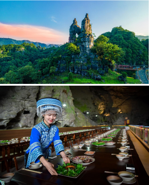 在兴文石海景区,游客可以亲身体验苗装旅拍、学唱苗歌,还可以在特定时段参与苗族婚俗表演、苗族花山节、僰人赛神节等民俗活动,感受非遗文化的魅力,更能入住天下奇观豪生苗族文化主题酒店,深入了解苗族的历史风情。景区开发了苗家长桌宴、小勾留文创酒、僰人虎生茶等特色产品,丰富了景区游客的旅行体验。