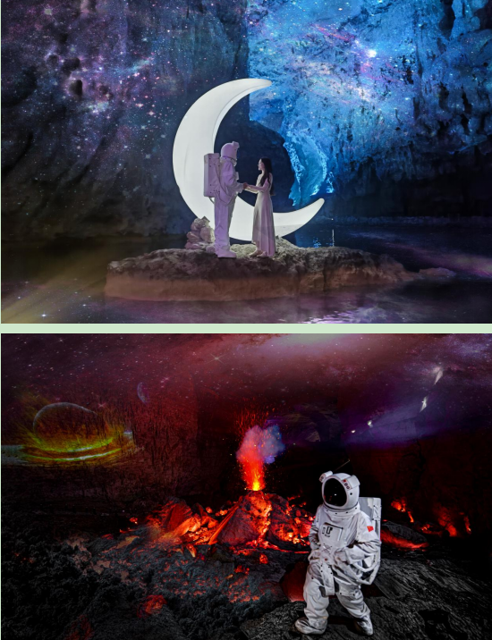 兴文石海景区充分利用天泉洞洞厅宏大的自然优势,结合数字技术和场地条件,以“地质+航天”为主题,打造了浪漫星河、火山熔岩、月球基地、宇航洞降等沉浸式光影项目。其中,火山熔岩项目获评第十七届中照照明奖二等奖,《兴文石海异星登陆》科幻短片荣获宜宾市“时代光影·百部川扬”短视频大赛最佳创意奖。