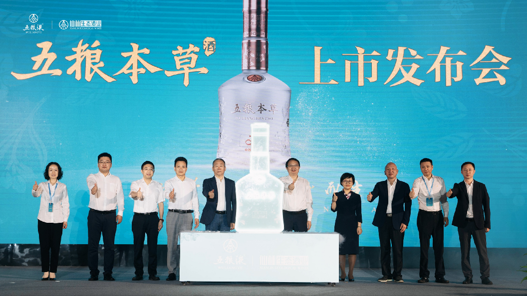 新品官宣是本次发布会的重头戏。发布会上,宋书玉、曾从钦、庹先国、王旭亮、杨韵霞、蒋佳、刘洋、赵东、李小波共同进行新品创意揭幕,见证“五粮本草”新品上市的荣耀时刻,伴随着带有仙气的展台缓缓打开,五粮液仙林生态酒业战略产品五粮本草新品正式亮相发布。
