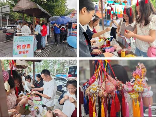 本次活动以群众参与体验为主,活动现场热闹非凡。随着舞台上颇具地方特色精彩节目的呈现,在包粽子体验区,广大市民朋友们有序排队,体验包粽子的乐趣。参与活动的群众们技术娴熟,大家一边包粽子一边话家常,折粽叶、装糯米、缠线……一个个粽子胖乎可爱,看着就十分有食欲,在潜移默化中使大家深深感受到传统饮食文化的魅力。在制香囊体验区内,江安职校师生们带来了他们手工制作、形态各异的香囊。他们耐心教授群众制作香囊的要领,现场群众跟着同学们一起学习制作香囊的技巧,剪造型、缝制、装艾叶.....一个个香囊造型丰富、精致可爱。通过亲手制作,用心感受传统手工艺作品的韵味。
