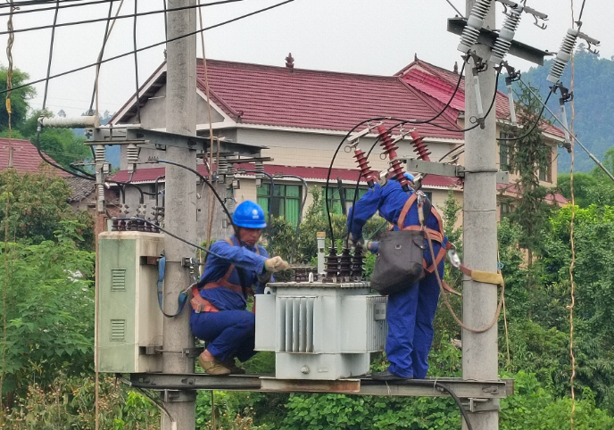 9时21分,准备工作完成。“文勇、王平春登杆验电,吊装作业人员做好吊装准备,马上开始作业。”收到供电所运维人员的许可后,李凯下达了开工指令。拆除旧变压器设备线夹螺丝及引流导线,捆绑好旧变压器……在队员们的密切配合下,旧变压器被缓缓吊起。队员们将新变压器安装在台架横担上,并连接导线、紧固螺丝。