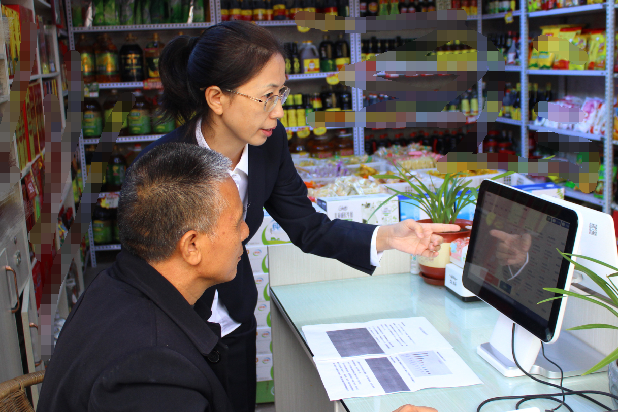 | 高县县局(分公司)客户经理何珏(右一)指导零售户运用互联网开展政务服务 |