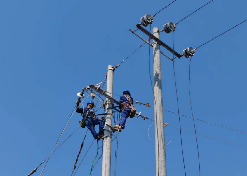 施工当天,工作人员顶烈日冒高温,在杂草丛生的乡间小路上转运电杆、架设线路、装表、接线……秋后的天气依然炎热,不一会儿,工作人员一个个满脸通红、汗流浃背、衣衫湿透,但没有一个人喊声苦、叫声累。经过两天的连续施工,共组装横担6付,架设线路550米,低压配电箱1套。