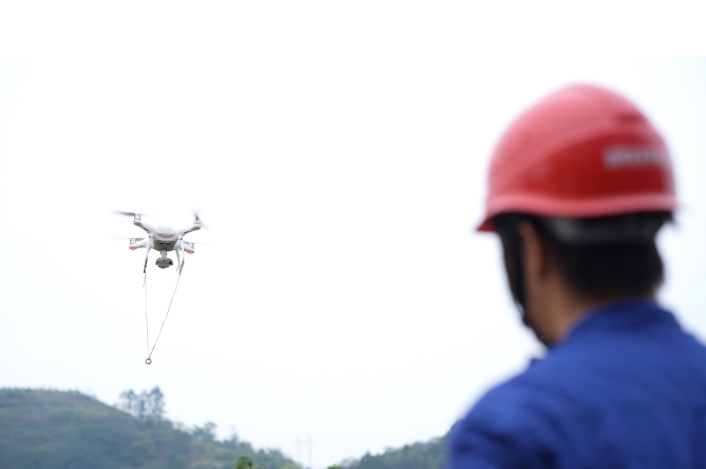 在施工现场,一架无人机在“飞手”的操作下缓缓升空,带动地上的牵引绳,将其牵引到树丛对面在杆顶等待接应牵引绳的杆上作业人员手中。由于现场地形地貌复杂,施工难度较大,按照以往传统架线方式,需要花费较多人力,使用无人机展放引线后,极大的提升了工作质效。
