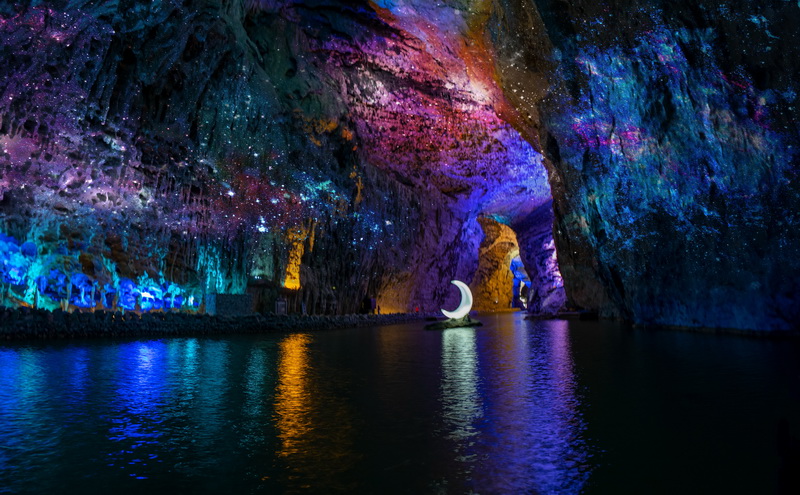 结合游客不断提高的审美和游览需求,景区利用长廊水洞的水体景观和洞厅空间,将原来五颜六色的霓虹灯改造成科技光影,将单调的交通船项目升级为浪漫星河游。遨游洞厅,银河高悬、流星璀璨、波光粼粼,游客可以一边欣赏地质奇观,一边感受星河烂漫,沉浸式体验溶洞的意境美。