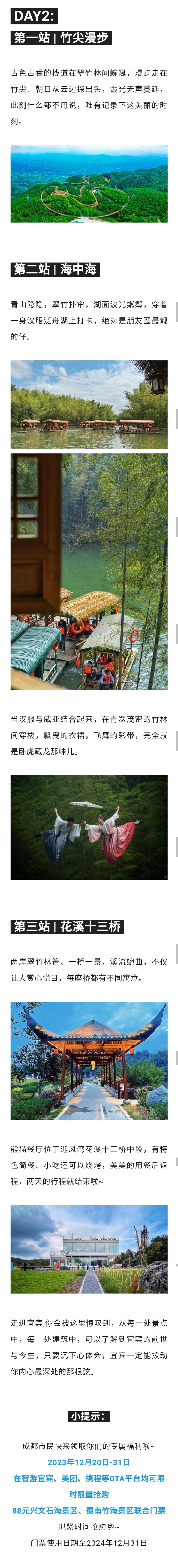 四川新闻网消息 宜宾,是一座充满诗情画意的城市!将长江水之美与当地的风土人情演绎到了极致,是一个让人无限向往的城市,直达宜宾的成宜高铁正式开通!成都的小伙伴们注意啦!兴文石海、蜀南竹海联票特惠来袭~2023年12月20日-31日在各大OTA平台均可限时限量抢购!让我们一起打卡宜宾吧!
