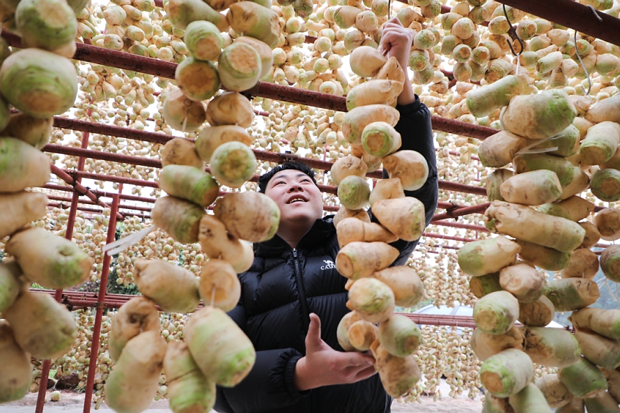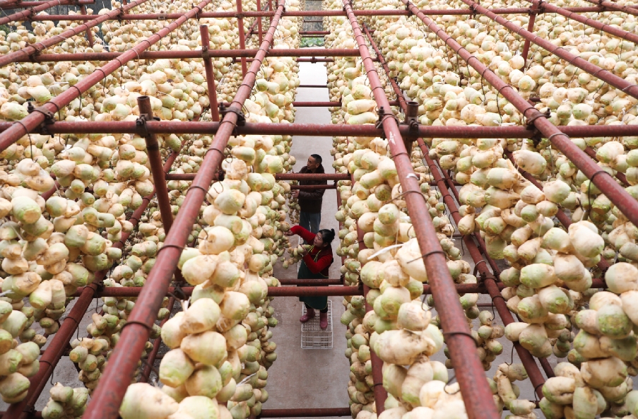 在位于常庆村的大头菜生产企业内,村民郑世伦、唐大芳等人正熟练地将一颗颗大头菜串连起来。不远处,在七八米高的晾晒架上,紧凑而有序地挂上了一串串大头菜,每串约有25颗大头菜。“根据天气情况的不同,这些大头菜要经过7到15天的晾晒,之后就会进入到车间进行切制。”该公司总经理张思浩介绍,从去年11月开始,就进入到晾晒期,目前已晾晒了600多吨大头菜,光是串晒工作就要用到四五十个村民。