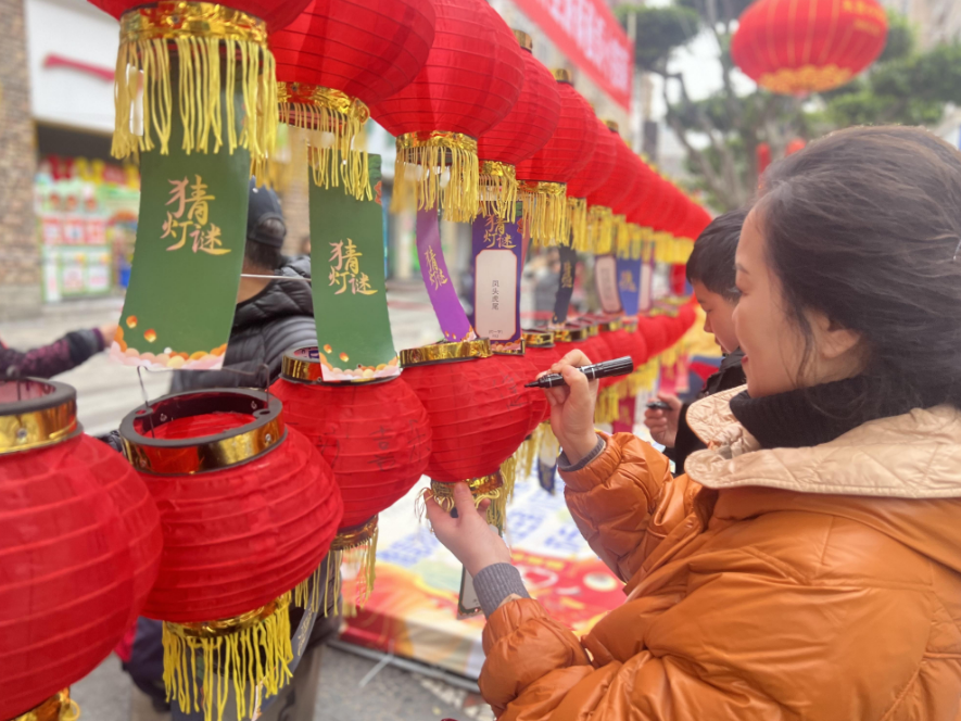 步行街悬挂的灯谜墙前已经驻足了不少居民,灯笼上五花八门的谜面吸引了大家争相竞猜,“猜对啦!”猜到正确答案的居民心情愉快地到工作人员处领取元宵礼品。