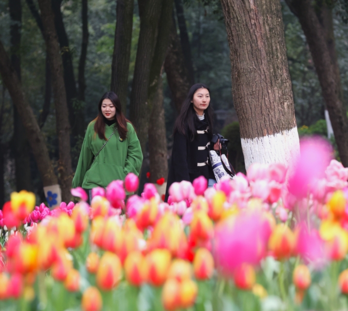 翠屏山轻运动中心实现全开放式观赏。登上台阶,从两旁树上精美的图案、悬挂的大红福字和龙年玩偶,可以看出春节期间的喜庆氛围依然留存。进入赏花区,郁金香、虞美人、一串红等鲜花正在开放,游客纷纷在花海中的空地赏花、拍照。