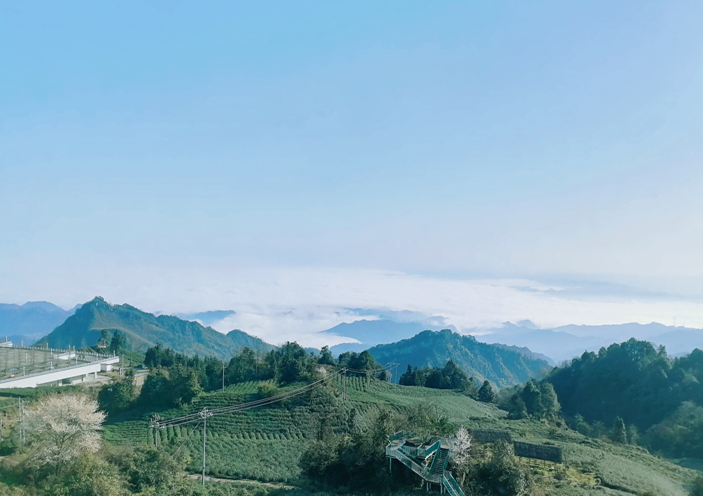 每逢雨季,在天宫山的上空,茶园、民居、山谷、丛林在云雾中若隐若现,形成壮美的云海景观,宛若一幅流淌的绝美画卷。(供稿:叙州区蕨溪镇)