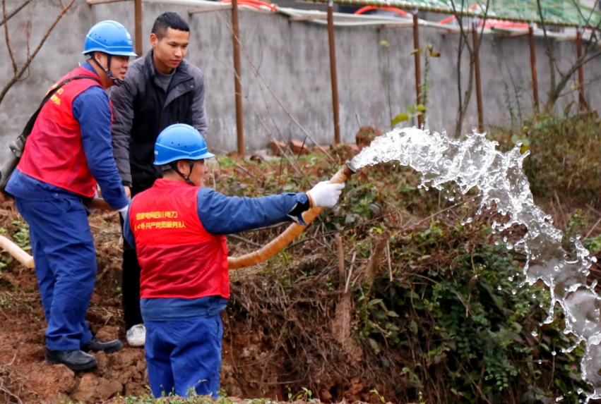 经过一系列用电检查和通电工作准备,随着泵机启动键按下,十几米外的管道口不一会儿水花飞溅,一股强劲的水柱喷涌而出,直冲向焦渴的土地。