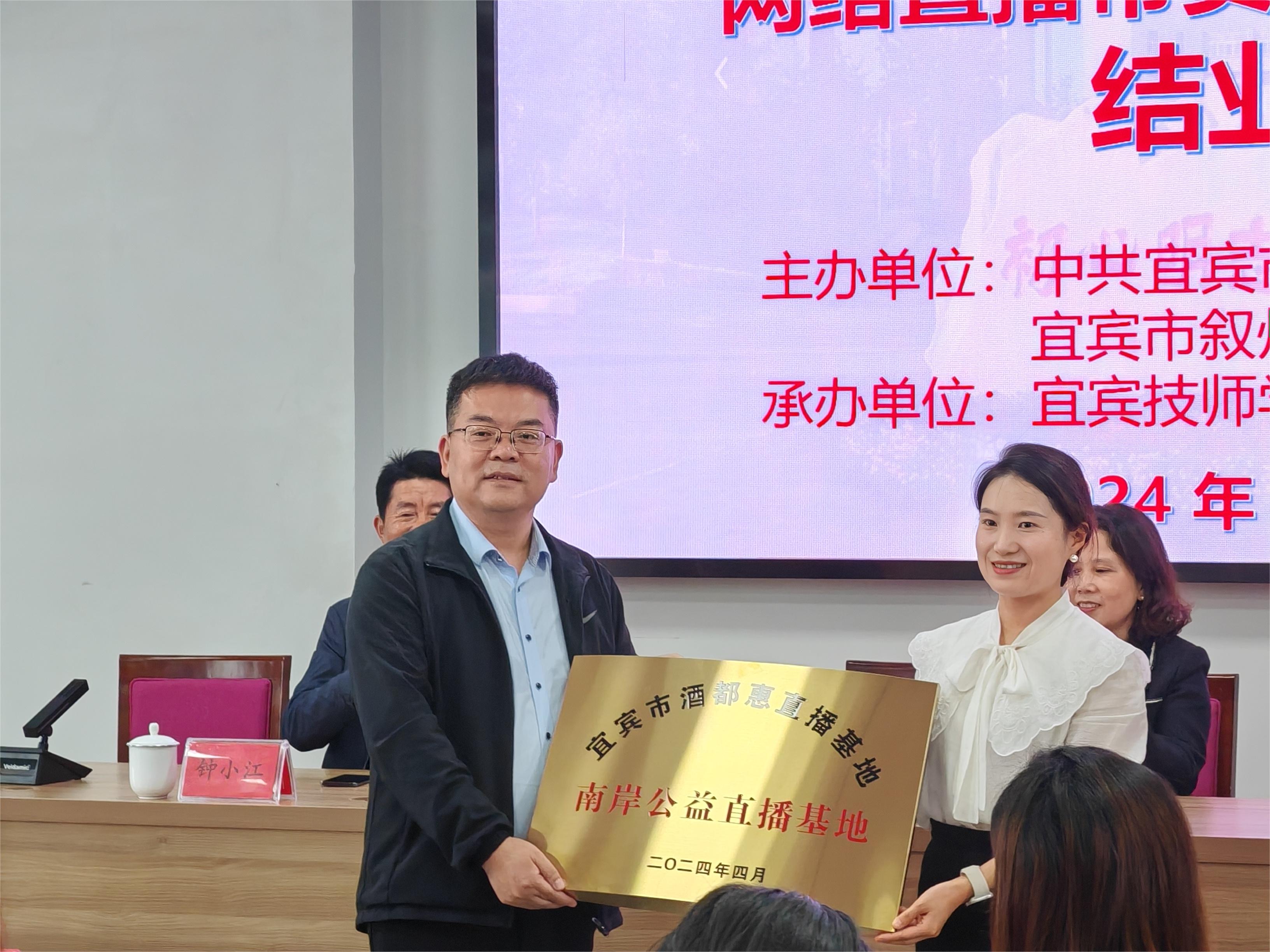 叙州区南岸街道党工委委员、组织委员、宣传委员、政协委员周敏发表致辞,并接受宜宾市酒都惠直播基地“南岸公益直播基地”授牌。(供稿:叙州区南岸街道)