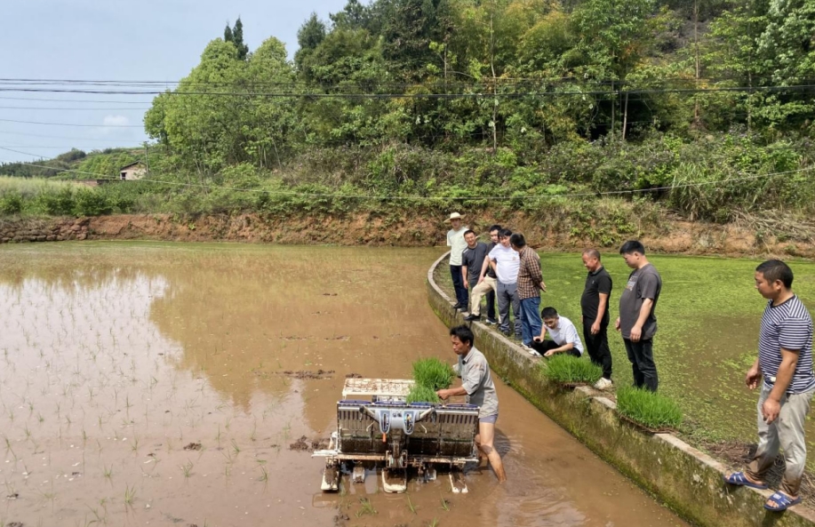 在菜子村集中育秧基地和村办公室,与会人员通过现场观摩和听取汇报等方式,详细了解了集中育秧、秧苗移栽、旋耕平田、机插秧等技术以及川酿优1号五粮液定制水稻生产计划。