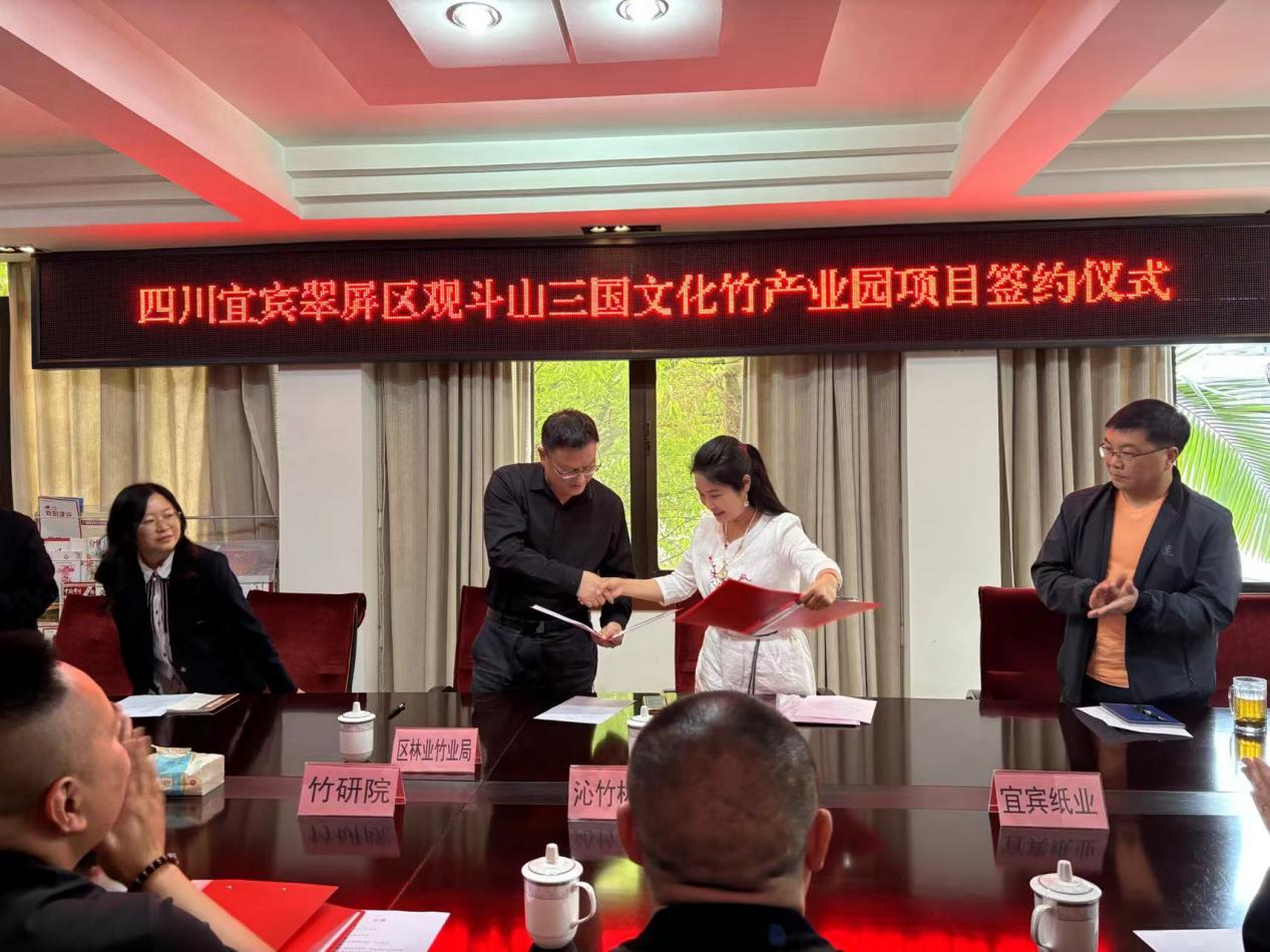 会议首先举行了签约仪式,翠屏区林业和竹业局分别与四川观星文化旅游有限公司签订了《三国文化竹产业园项目合作协议》,与宜宾好劲道有限公司签订了《“以竹代粮”推广应用项目协议》。会上,宜宾林竹产业研究院技术人员就竹笋高膳食纤维配方科研成果转化思路进行了介绍,与会人员围绕“以竹代塑”、竹食品以及竹产业相关配套服务作了交流。