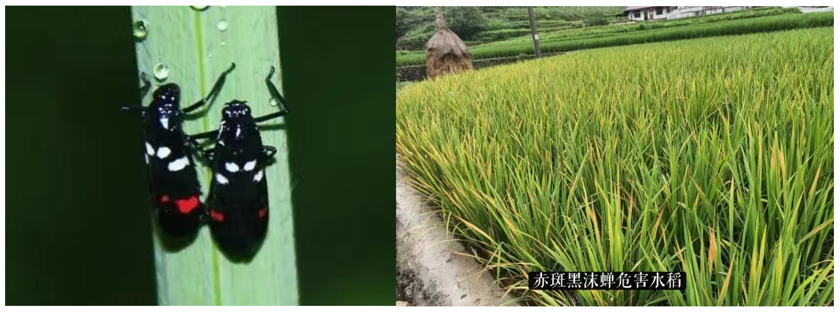 四川新闻网消息 水稻赤斑黑沫蝉,俗称“雷火虫”,其通过口器吸食禾本科植物叶片的汁液为生,最喜危害水稻,也会取食玉米、高粱以及其他禾本科作物。一般以稻田的四周水稻受害严重,其成虫先刺吸水稻剑叶上部,使受害部位呈现赤斑小点;继而由上而下沿叶脉扩展延伸,使叶脉变成赤红色;再由叶脉变成赤红色;再由叶脉向两边蔓延,导致剑叶上半部全部赤红;最后,随着水稻渐近成熟,剑叶整片变赤,继而退色呈淡黄色,直至坏死枯白。目前翠屏区已有零星发生,个别田块偏重发生。