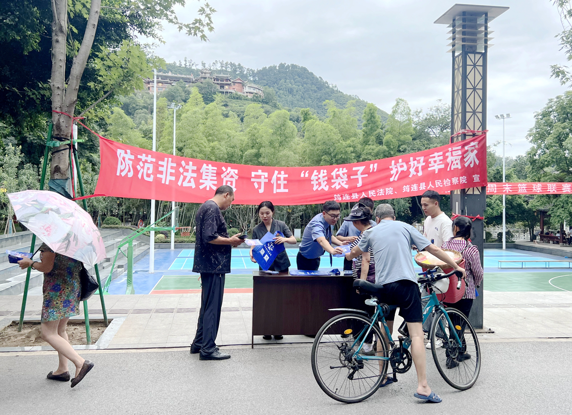 四川新闻网消息 为防范非法集资,保护公众合法权益,防范化解金融风险,维护经济秩序和社会稳定,6月20日,筠连县法院携手筠连县检察院在筠连县玉壶公园池子球场开展防范非法集资普法宣传活动。
