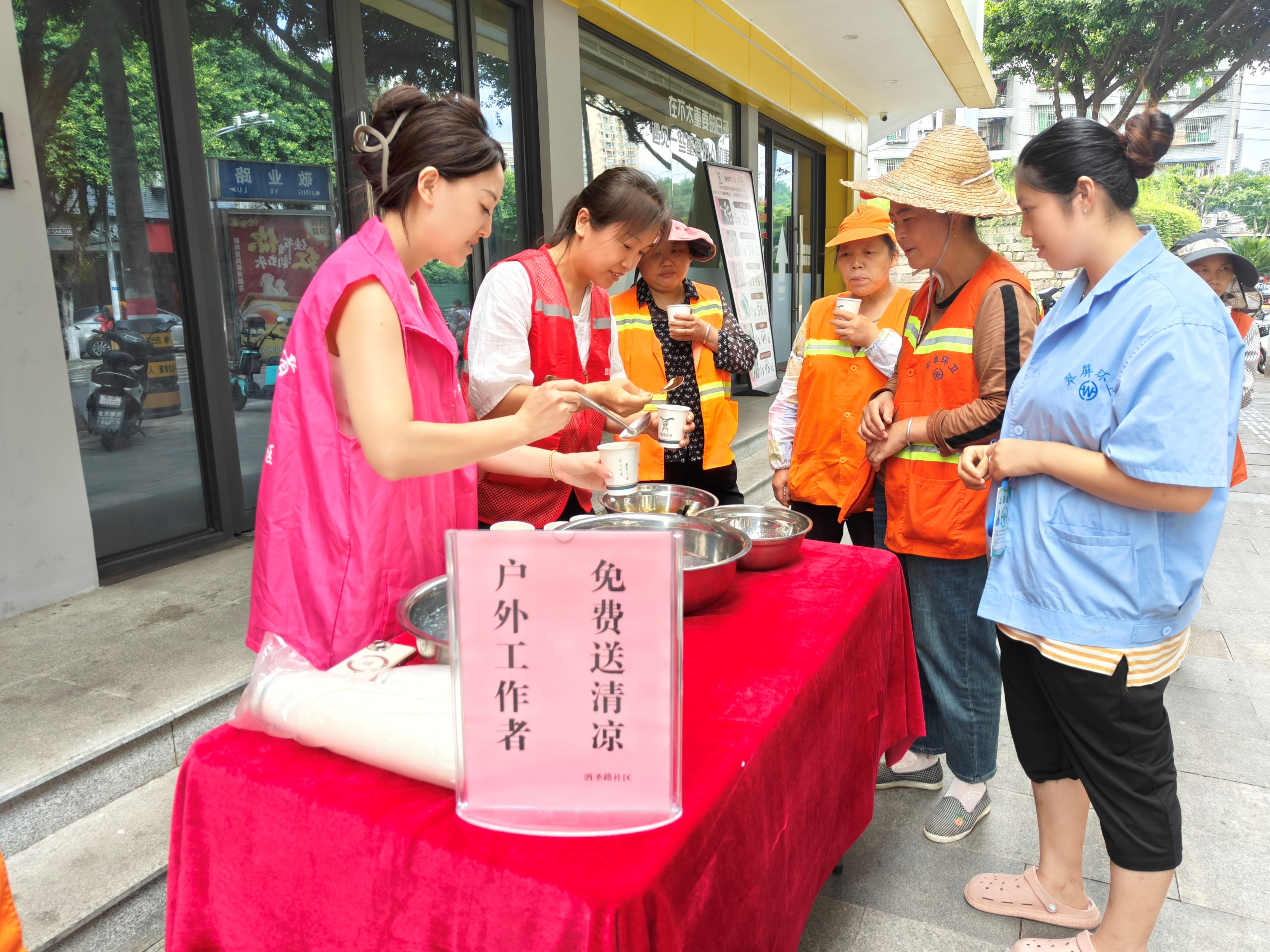 “清凉站”免费发放清凉饮品。社区在门口设立了一个站点,每天向外卖小哥、环卫工人、快递员及来往行人免费发放凉糕、冰粉、绿豆汤、西瓜等消暑佳品,还有一大桶免费取用的凉茶,为炎炎夏日带来一丝凉意。