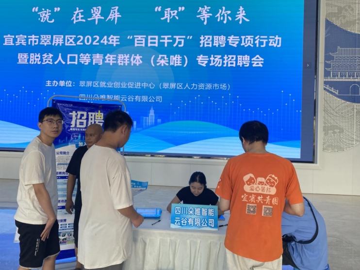 为进一步做好市内重点企业用工保障,促进脱贫劳动力实现就近就地就业,确保其持续增收,助力巩固脱贫成效,9月12日上午,翠屏区就业创业促进中心联合四川朵唯智能云谷有限公司举办了一场别开生面的专场招聘会。