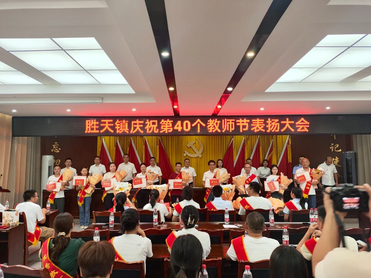 近日,高县胜天镇召开庆祝第40个教师节表扬大会,礼赞灵魂工程师 ,致敬筑梦引路人。胜天镇党政班子成员、优秀教师和优秀教育工作者、中小学幼儿园行政班子、各村(社区)支部书记等参加大会。
