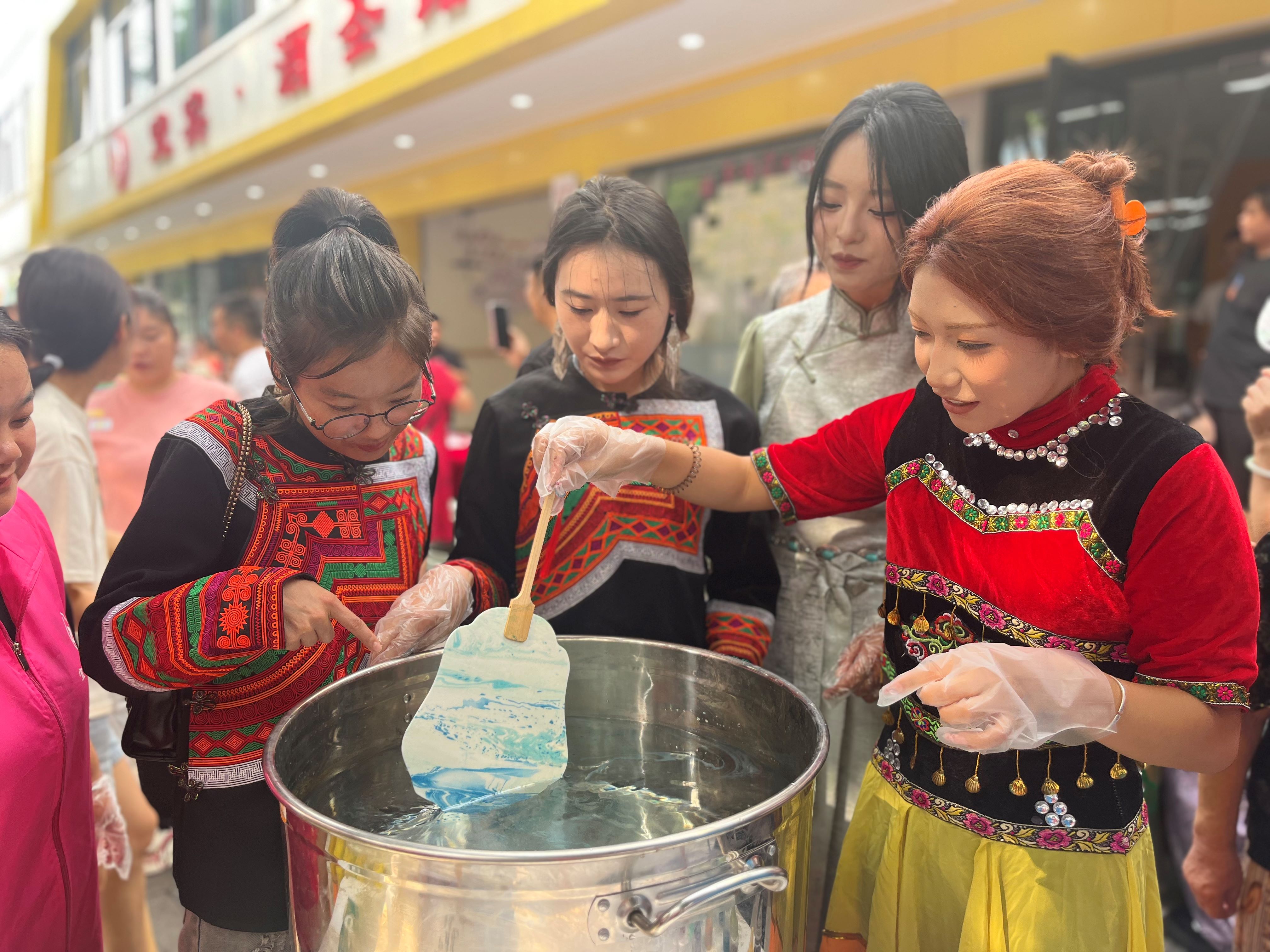 活动邀请了宜宾学院彝族传承协会的同学们,通过悠扬动听的民族歌曲和上身展示的民族服装,让居民领略到多彩的民族文化。现场还有漆扇制作、打糍粑、舞蹈展示、月饼分享等环节,让少数民族和周边群众充分体验中华传统优秀文化。活动现场设置专门的打糍粑区域,大家轮流上阵,手持木槌,合力将热气腾腾的糯米饭捶打成软糯的糍粑团。打好的糍粑现场制作成了各种口味的甜点和小吃,大家围坐在一起分享美食、交流心得,增进彼此间的情谊。