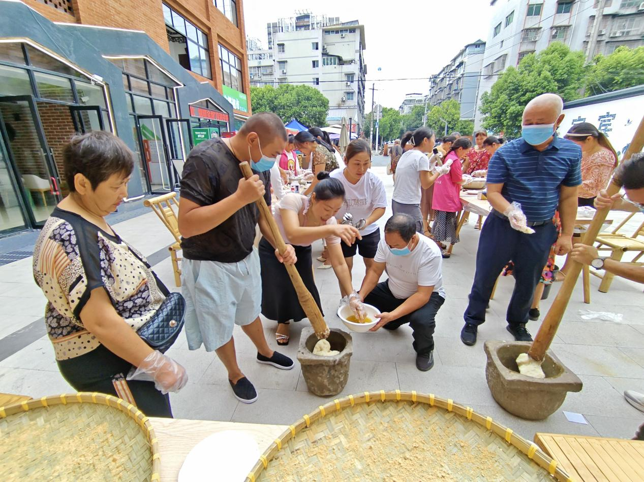 接下来的月饼制作和打糍粑环节将本次活动推向了高潮。首先月饼制作环节将参与活动居民分为两组,每组七人,每人负责月饼制作的不同环节,包括揉面、压膜、包装等,在主持人的悉心指导下,一个个精致的月饼应运而生,现场弥漫着温馨与欢乐。紧接着的打糍粑环节更是让每位居民都亲身参与,大家齐心协力,将软糯的糯米在石臼中捶打成团,欢声笑语中,邻里间的情谊悄然加深,居民们不再是旁观者,而是成了这场文化的创作者,他们以手为笔,以心为墨,在面团与糯米间绘出了团圆的味道。