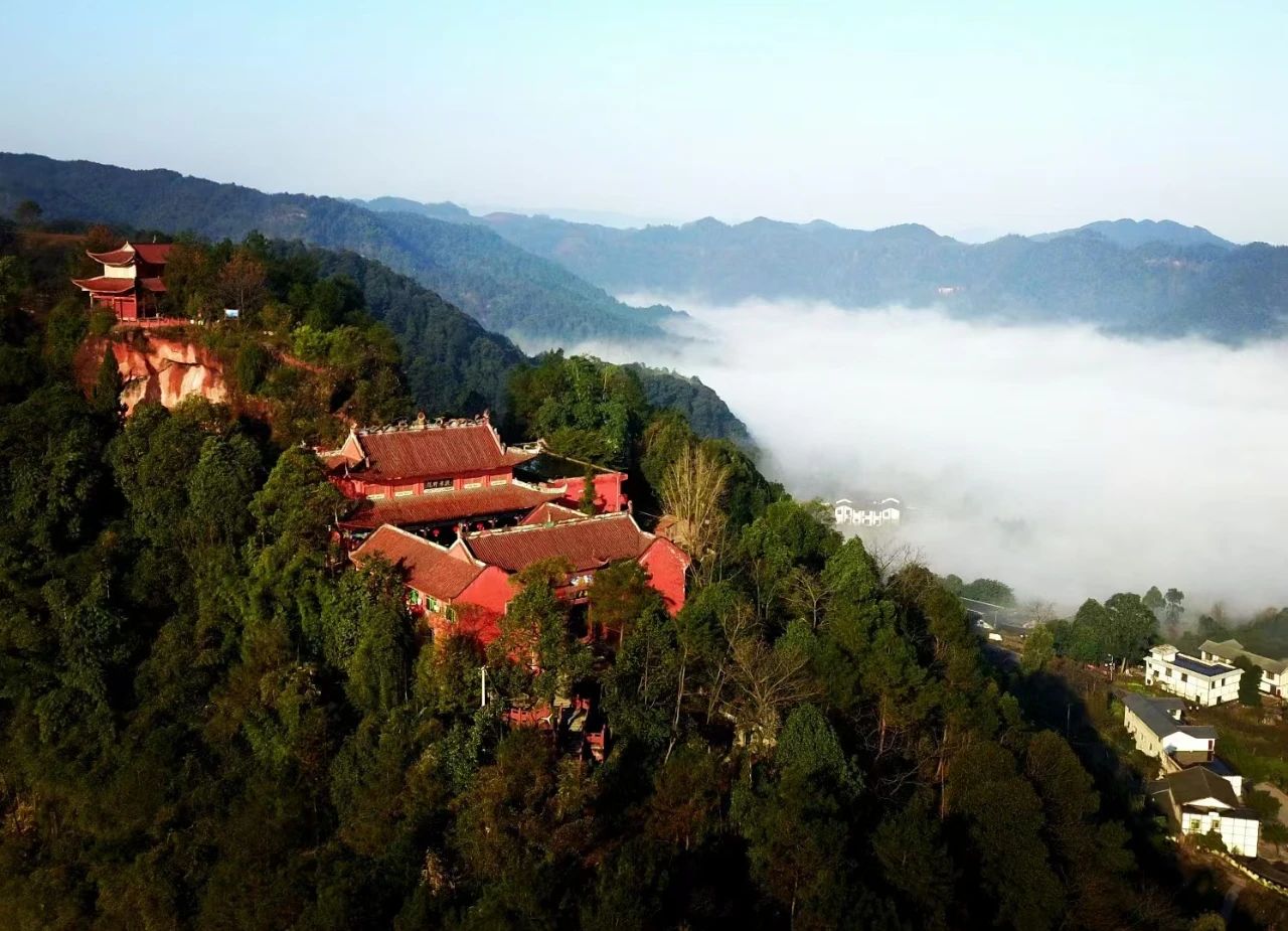 山谷的雾随山脊的风,时浓时淡,如飘渺、摇曳的烟岚,于溪湖林竹间渐次升起汇聚,与印台山相拥,同桫椤相伴,携古村相眠,将红墙古寺隐于一方净土之上,宛若蓬莱仙山,为胜天红岩山。