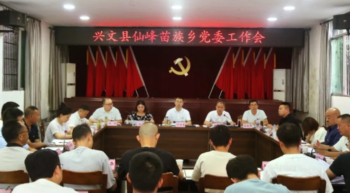 近日,仙峰苗族乡召开党委工作会议。兴文县委常委、统战部部长、乡党委书记江北春出席会议并讲话,乡党委常务副书记魏小金主持会议。仙峰苗族乡党、政相关负责人,各村(社区)支部书记,各站办所负责人参加了会议。