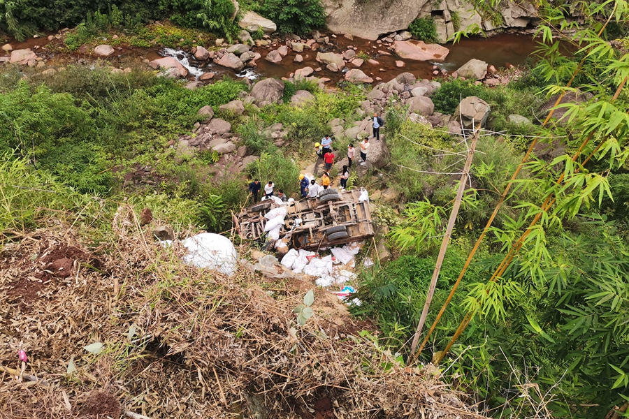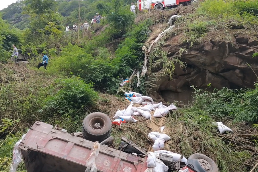 8时33分,消防救援人员到达现场后,据现场目击者称,货车司机是在错车过程中,操作失误导致倒车坠崖,沿途树木全被撞到压坏,四周洒满了运输的饲料,透过树木间隙,只能隐隐约约看见一辆红色货车侧翻在半山腰,距离盘山公路路面50多米,崖底山坡极其陡峻,坡度将近90度,且乱石遍布、荆棘丛生,周边没有可以上下的路,救援难度很大。