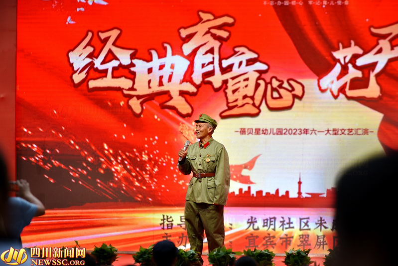 在宜宾三江新区临港中央APM广场,光明社区联合党建联盟成员单位蓓贝星幼儿园开展了“经典育童心 花开新时代”文艺活动,特别邀请到82岁老党员、退役军人程树开为孩子们讲述红色故事、时代变迁,赢得了孩子们以及家长的阵阵热烈掌声。