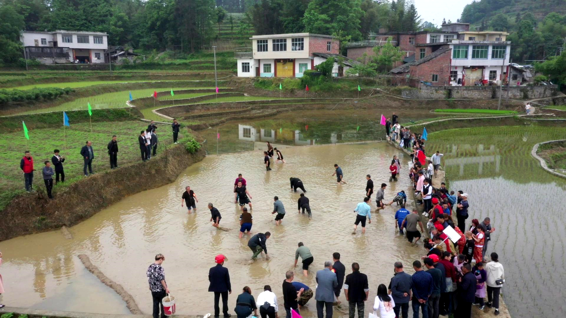 选手在满是泥浆的稻田里去“浑水摸鱼”,特别考验抓鱼技巧。随着裁判一声令下,参赛选手迫不及待地跳进水塘,全力围捕稻鱼。霎时,稻田内一片沸腾,抓鱼者的欢呼声、迸溅的水花声、观众们的加油声此起彼伏,将活动气氛推向高潮。活动还穿插了村歌《兴隆兴旺》广场舞表演。