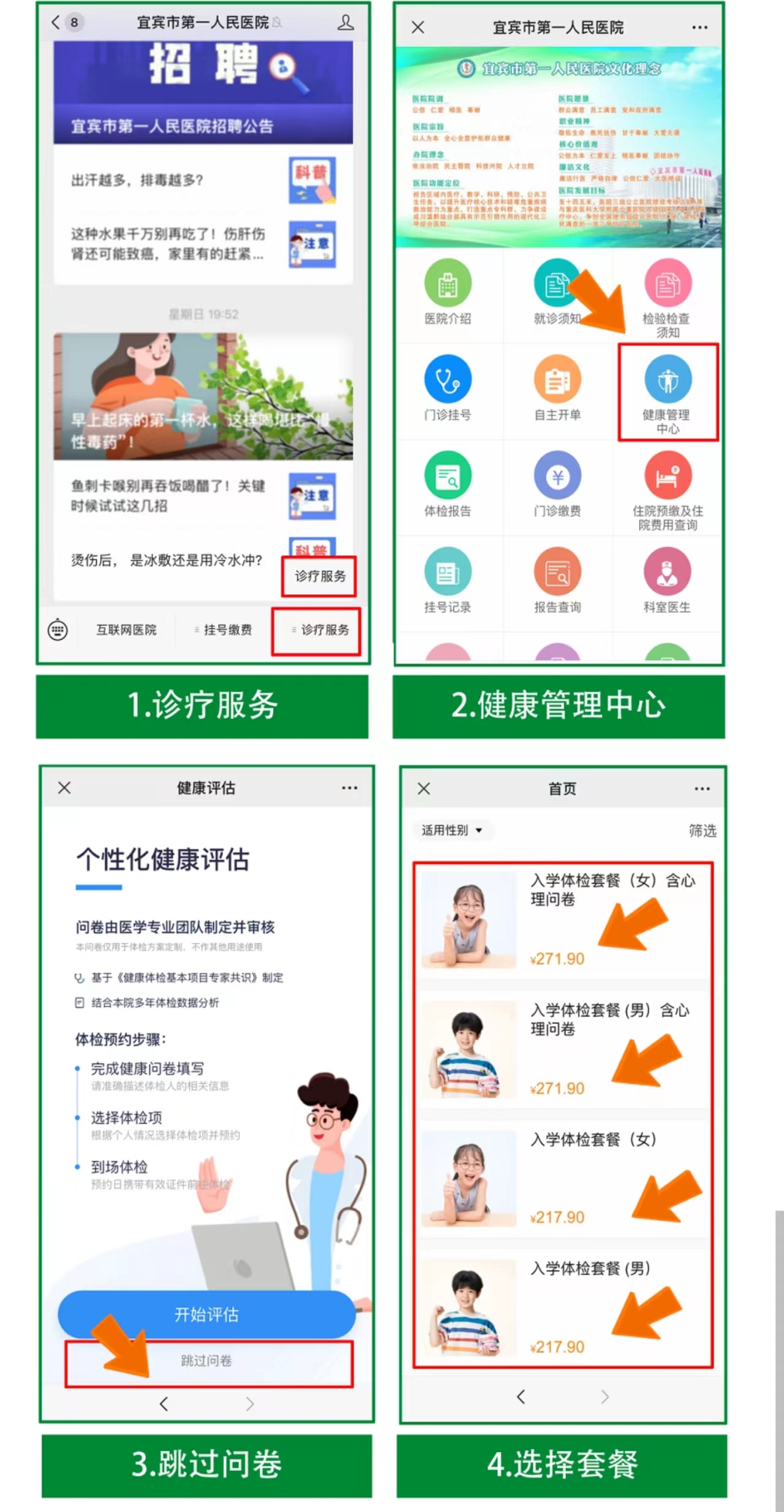 关注“宜宾市第一人民医院”公众号,选择诊疗服务→健康管理中心→个人体检→选择对应的入学体检套餐→提交订单。