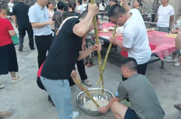 在古宋镇百家渡社区,活动从共享蛋糕和月饼的美味时刻开始,钓月饼、套圈和投乒乓游戏环节吸引了不少居民参与,现场欢声笑语不断,参与者们各显身手争取获得心仪的奖品。百家渡社区家风家训文化长廊里,一盏盏色彩斑斓的灯笼下悬挂着各种有趣的灯谜,居民们或驻足思考,或相互讨论,猜对谜底的喜悦洋溢在脸上。活动的高潮要数打糍粑环节,打糍粑是苗族的传统习俗,工作人员将早早就准备好了的熟糯米倒入碓窝中,居民们立马围拢过来,轮流挥动木杵,你一下我一下地打着糍粑,好不热闹。糍粑打好后,大家各自取下一小块裹上黄豆粉、白糖等蘸料,享受这共同努力的成果。