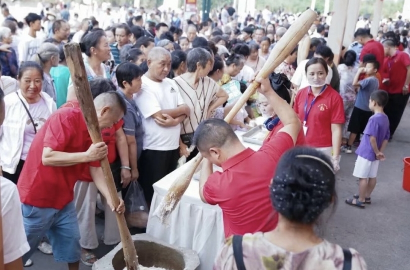 在农夫集市上,群众通过参与打糍粑的活动,相互配合、团结协作、共同努力让糍粑成团,也将彼此紧紧的粘黏在一起。糍粑黏结成团,寓示着和睦团结;糍粑的香甜,寓示着生活甜蜜幸福;吃着香甜软糯的糍粑,自然象征大家和和气气、团团圆圆。