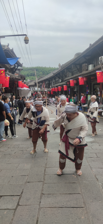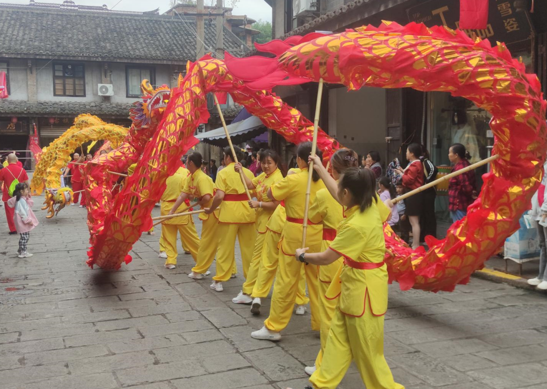 当天上午10时许,随着锣鼓声的骤然响起,两条20余米长的巨龙,在舞龙表演者们的挥舞下,摇头摆尾地朝场镇“飞”去,群众喝彩连连。随即,唱着关河号子的表演者们,身着纤夫服饰、肩套纤绳,动作整齐、步履铿锵,拉动着旱船在古镇古街上巡游,并向本地居民、游客朋友们挥手致意,将活动推向高潮。