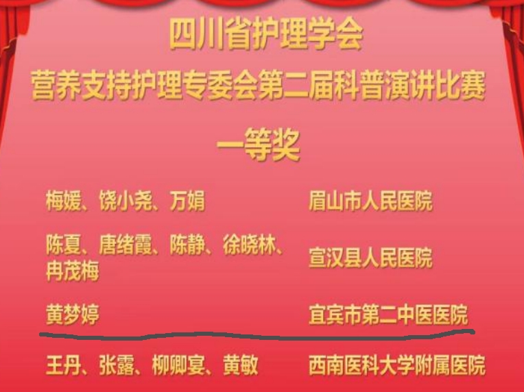 11月1日,四川省护理学会营养支持护理专委会第二届科普演讲比赛举行,宜宾市第二中医医院重症医学科护理人员、参赛选手黄梦婷从40多个参赛作品中脱颖而出,荣获一等奖。
