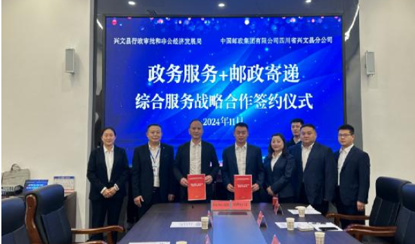宜宾市兴文县高质量推进政务服务标准化规范化便利化工作,进一步拓展服务范围,增加特色服务事项,提高政务服务便民利企效率。2024年11月7日下午,兴文县行政审批和非公经济发展局与中国邮政集团有限公司举行“政务服务+邮政寄递”综合服务战略合作签约仪式。双方就政务服务延伸、便民应用拓展、工业品下乡农产品进城以及便民综合服务渠道多元化建设等优化政务服务系列合作事项达成一致意见。