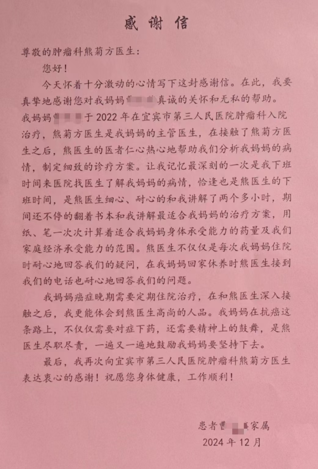 在医疗这片神圣的土地上,每一份付出都承载着生命的重量,每一次努力都凝聚着医者的仁心。近日,宜宾市第三人民医院肿瘤科医生熊菊方、华杨分别收到患者家属赠送的锦旗和感谢信,这不仅是对医护人员的最高赞誉,更是一段医患深情厚谊的见证。