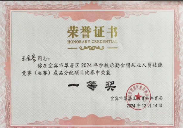 近日,宜宾市翠屏区学校第八届食堂从业人员、第六届宿舍管理人员技能大赛(决赛)举行。其中宜宾市李庄镇幼儿园食堂从业人员王金容在成品分配项目中荣获一等奖。(供稿、供图:宜宾市李庄镇幼儿园)