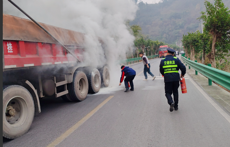 1月6日上午9时30分,宜宾市叙州区交通运输综合行政执法大队执法人员在开展每日例行路政巡查工作时,在向家坝专用通道K7+800处发现一辆半挂货车发生自燃,面对突发的险情,交通执法队员临危不惧,与驾驶员、过往群众相互配合,一边在现场摆放好安全警示标志,一边快速用灭火器向车身四周灭火,同时迅速拉起警戒线,疏散过往车辆。