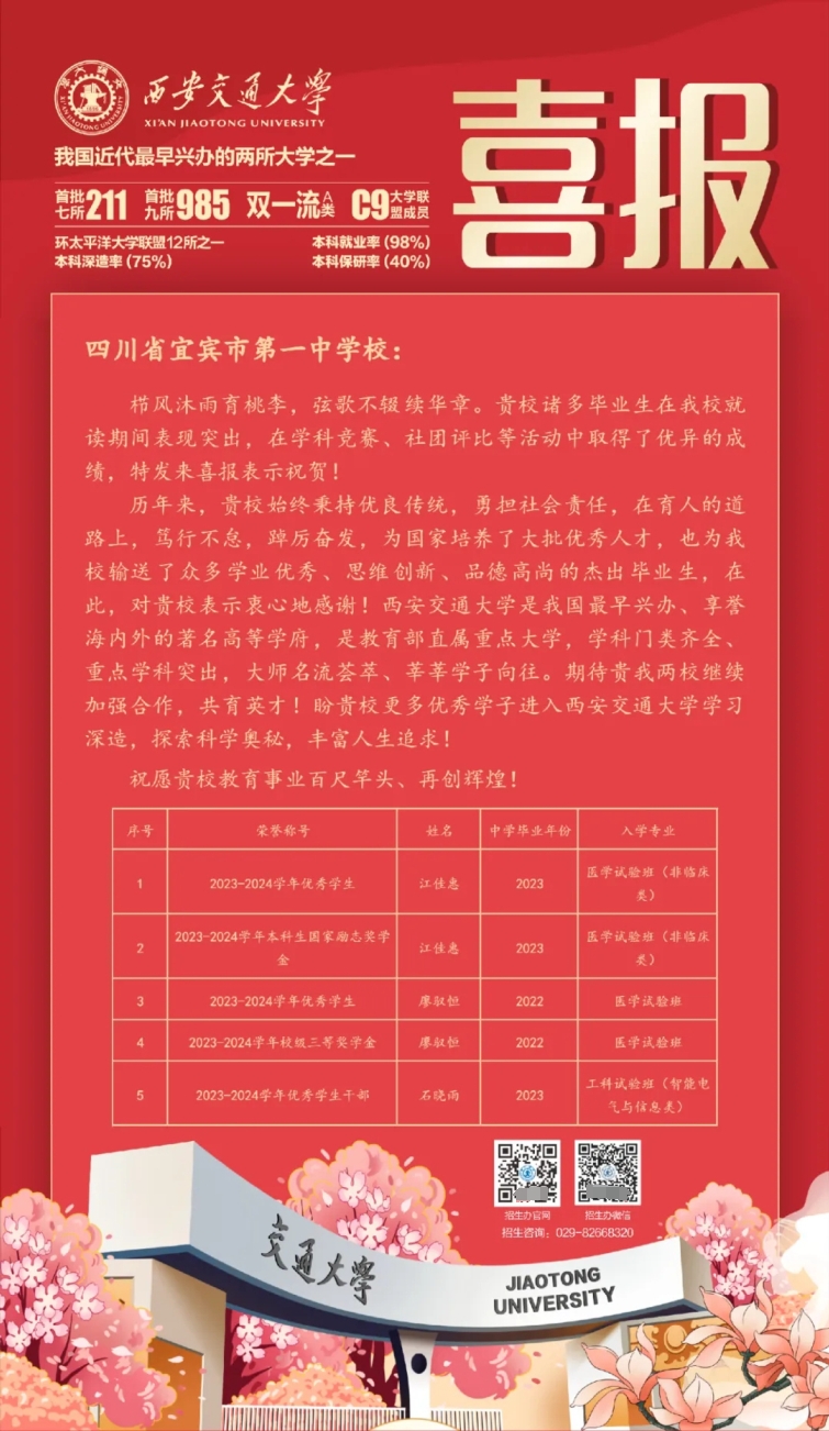 近日,西安交通大学向宜宾市一中发来喜报。宜宾市一中五名毕业生,砥砺奋进,锐意进取,取得优异成绩。宜宾市一中将继续加强与各大高校的合作,齐心协力,携手并进,共谱育人新篇章。(供图:宜宾市一中)