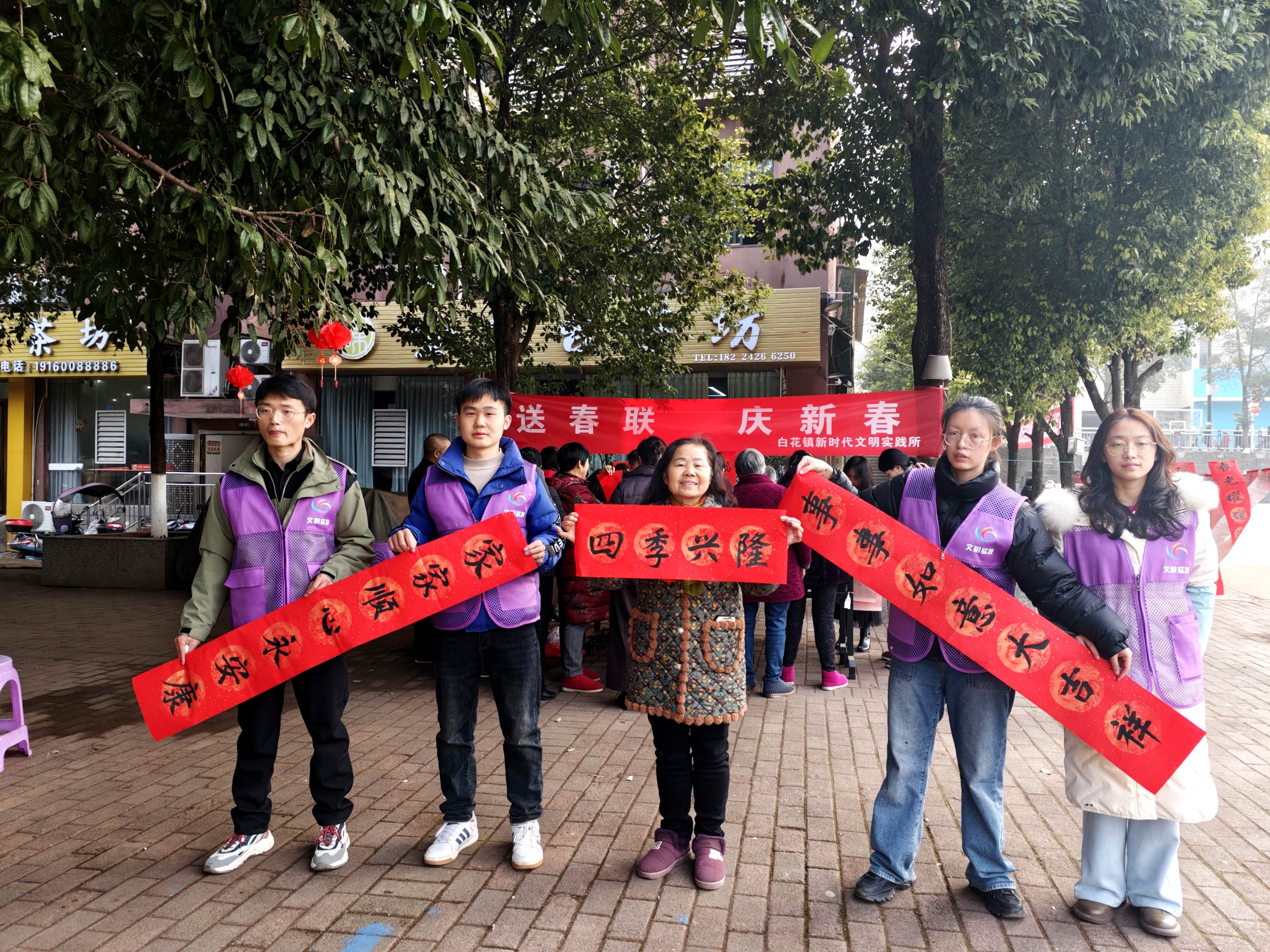 2025年1月15日上午,翠屏区白花镇新时代文明实践所携手挂点联系单位区委办公室,在白花镇一曼广场开启了一场以 “巳巳如意,情满翠屏” 为主题的文明实践服务活动。活动聚焦送春联、庆新春,旨在用传统民俗为即将到来的春节预热,将浓浓的年味与深深的祝福传递给每一位群众。