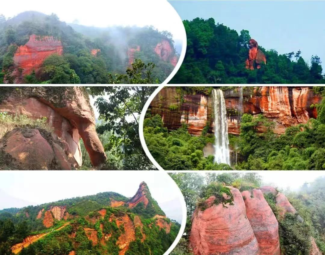 红岩丹霞映赤霞,翠谷碧树隐苍龙。亿年桫椤摇沧海,千叠石扉藏洞天。