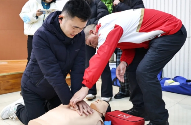 培训采用"理论授课+实践演练"模式。理论讲解环节,市红十字会应急救援支援服务队队长钟奏凯结合近年来的多发案例,重点围绕心肺复苏术(CPR)、海姆立克气道异物梗阻、自动体外除颤仪(AED)使用进行了详细的理论讲解。